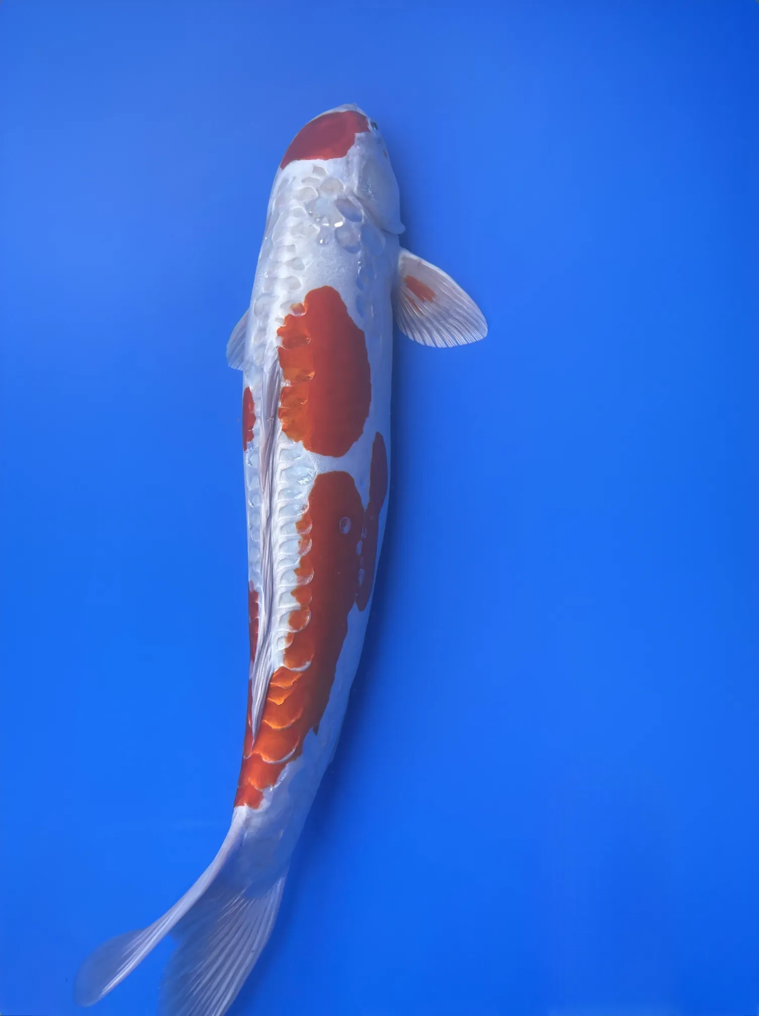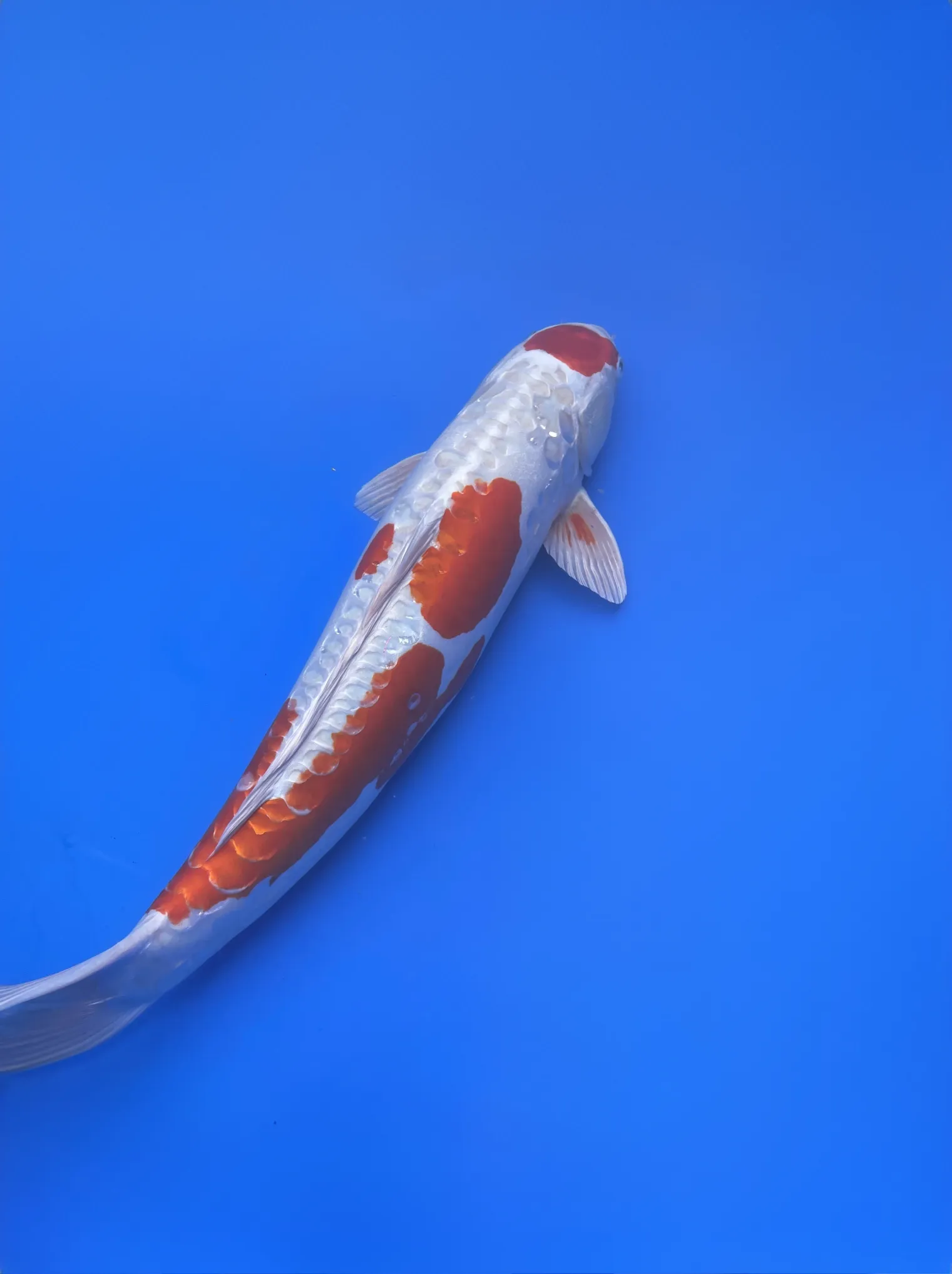 This Maruten Kikusui Nisai (55cm Male) from Sakazume Koi Farm radiates elegance and refinement. The brilliant metallic white skin and vibrant orange-red (beni) markings crowned with a perfect maruten spot make this koi a centerpiece in any collection. A fine example of Sakazume’s excellence in Doitsu Hikari Moyo breeding, this koi balances modern metallic sheen with timeless Japanese aesthetics.